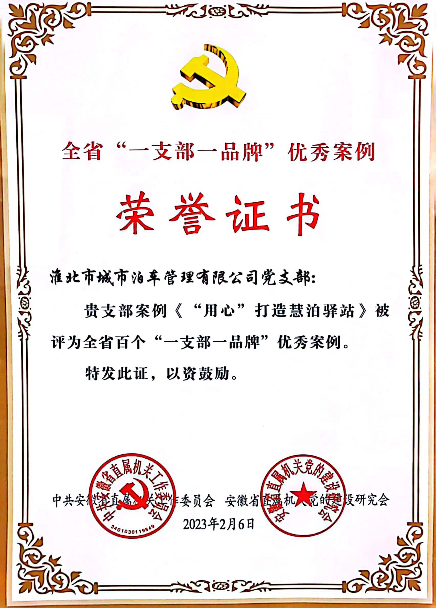 日前,中共安徽省直屬機(jī)關(guān)工作委員會(huì)、安徽省直屬機(jī)關(guān)黨的建設(shè)研究會(huì)聯(lián)合發(fā)文表彰了全省百個(gè)“一支部一品牌”黨建工作典型案例,此次“一支部一品牌”黨建工作典型案例評(píng)選全省共有400家單位586個(gè)優(yōu)秀案例參加初評(píng)和復(fù)審,最終綜合評(píng)定100個(gè)“一支部一品牌”優(yōu)秀案例?;幢背鞘胁窜嚬芾碛邢薰?/span>黨支部獲得通報(bào)表彰,支部的黨建品牌《“用心”打造慧泊驛站》獲評(píng)全省百個(gè)“一支部一品牌”優(yōu)秀案例。