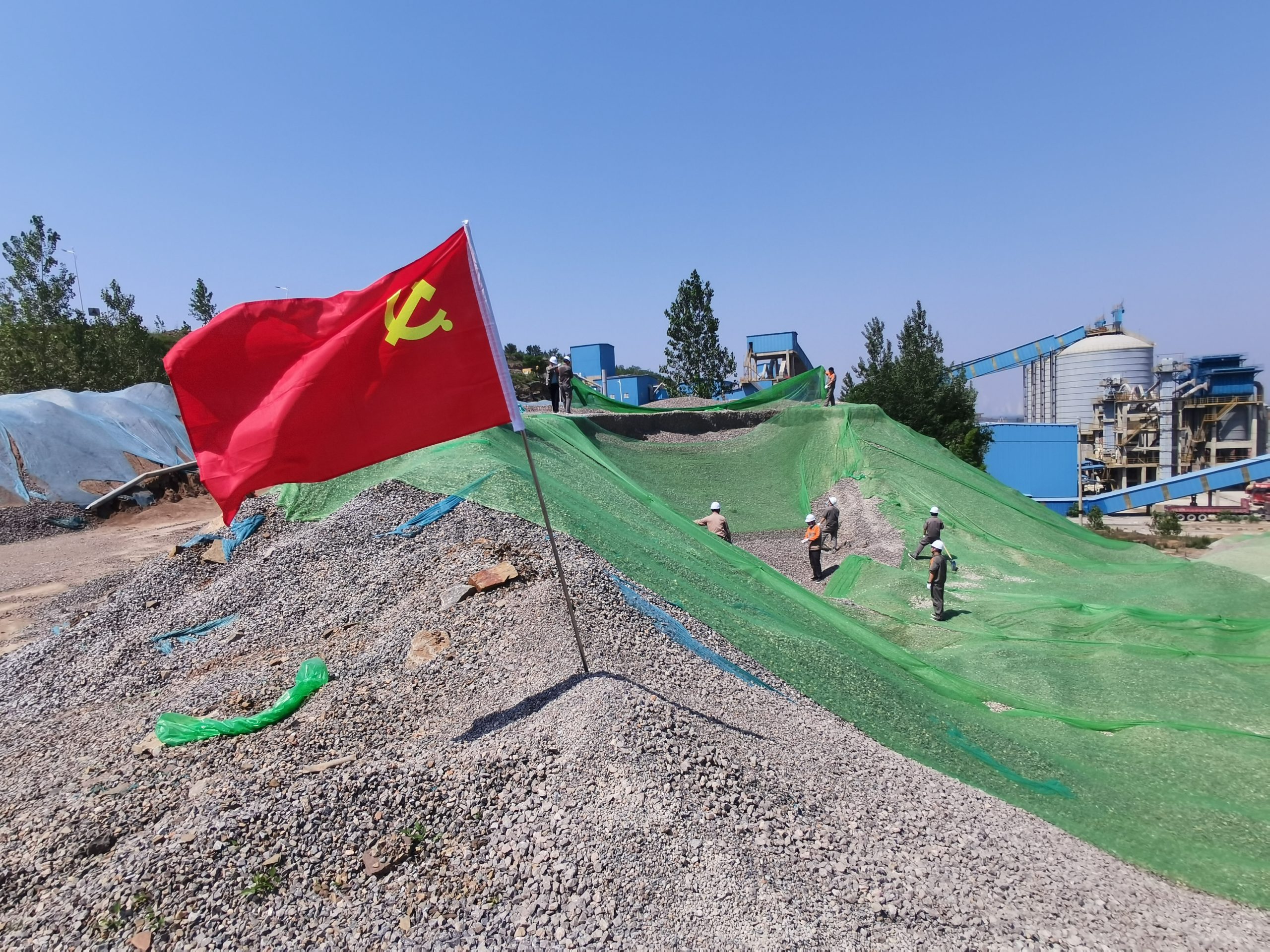 一個支部就是一座堡壘,一名黨員就是一面旗幟,行動是最有力的帶動,示范是最鮮明的垂范。為牢固樹立綠色礦山發(fā)展理念,堅決貫徹落實“綠水青山就是金山銀山”政策,2023年6月8日上午,通鳴黨支部組織黨員同志到汽修房處對裸露在外的石料進行防塵網(wǎng)的覆蓋,黨員同志們冒著酷暑,不畏炎熱,沖鋒在前,經(jīng)過一上午的努力,最終克服困難順利完成任務(wù)。通鳴黨支部著力發(fā)展基層黨組組織的戰(zhàn)斗堡壘作用和黨員的先鋒模范作用,通鳴黨支部始終堅守初心、擔當使命,敬業(yè)愛崗,用自己的實際行動讓黨旗飄揚在最高處。