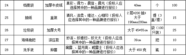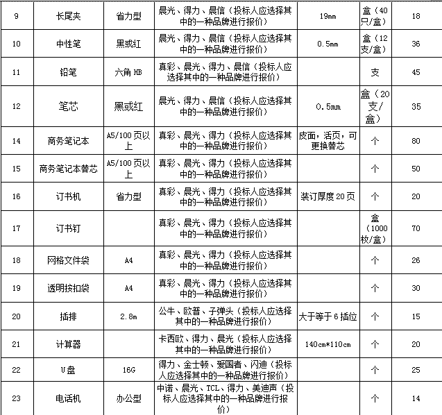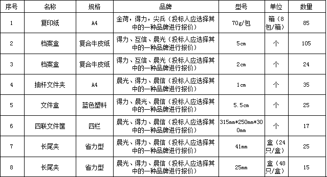 | 招標(biāo)范圍 | 包括但不限于辦公用品的生產(chǎn)供貨、包裝、運(yùn)輸、檢測、驗(yàn)收、質(zhì)保及售后服務(wù)等。如有漏項(xiàng)或缺項(xiàng),投標(biāo)人承擔(dān)全部責(zé)任。 | |||||||||