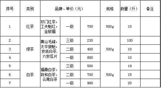 本項(xiàng)目是淮北市建投控股集團(tuán)有限公司2021年度茶葉采購(gòu)項(xiàng)目,具體如下:![]() 注;1、二級(jí)三級(jí)茶葉采用盒裝或罐裝包裝,一級(jí)采用禮品裝包裝(以采購(gòu)方實(shí)際需求為準(zhǔn))。 2、重量為除去包裝后茶葉凈重要求。 3、本次茶葉采購(gòu)具體數(shù)量可能略有變化,按照實(shí)際采購(gòu)數(shù)量確定。 |