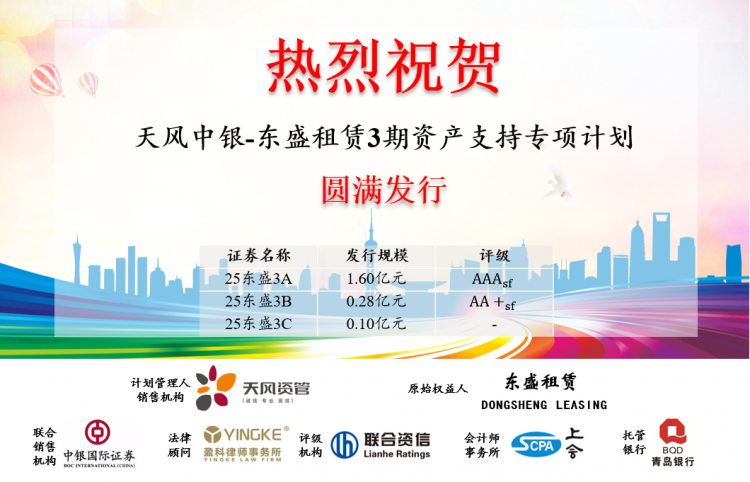 熱烈祝賀天風(fēng)中銀-東盛租賃第3期資產(chǎn)支持專項計劃圓滿發(fā)行