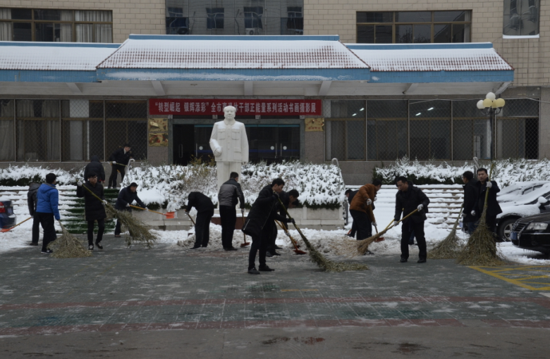 在紀(jì)委書記王獻(xiàn)忠、總經(jīng)理助理朱濤的帶領(lǐng)下,廣大干部職工紛紛拿起鐵鍬、掃帚等工具,不畏嚴(yán)寒,你鏟我掃,相互配合,一點(diǎn)點(diǎn)地將積雪和冰層鏟起清除。盡管大家的臉都凍得通紅通紅,但手中的掃雪工具卻不停地?fù)]舞著,忙得渾身是汗,在歡聲笑語(yǔ)中掃出了暢通的大道,受到過(guò)往市民的紛紛稱贊。