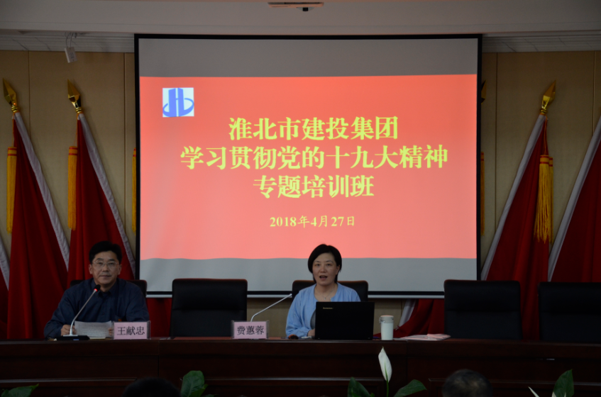 為深入學習貫徹黨的十九大精神,4月27日下午,市建投集團在五樓會議室舉辦黨的十九大精神專題培訓班?;幢笔形h校校委委員、法學與管理教研室主任費蕙蓉教授為淮北市建投集團廣大黨員干部專題解讀了習近平新時代中國特色社會主義思想和黨的十九大精神,來自集團公司的黨員干部近130人參加了本次專題培訓。