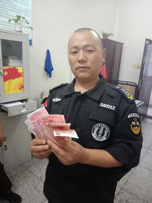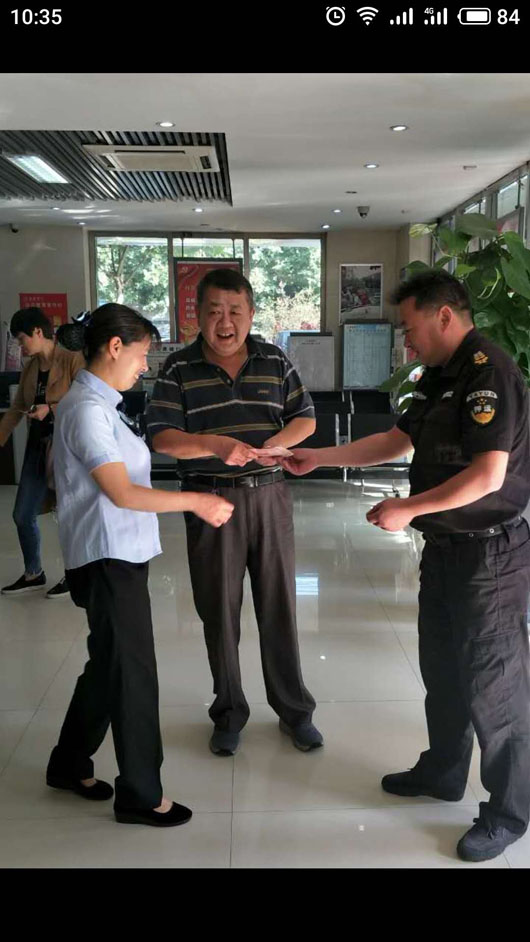 2018年9月28日17:10分,淮北市保安有限公司派駐淮北徽商銀行押運四中隊78號車組在濉溪徽商銀行虎山路支行執(zhí)行接款任務警戒時,車組長劉云寺在網點門口撿到現金700元。任務結束后立刻上交到中隊,中隊管理人員及時聯(lián)系徽商銀行保衛(wèi)科,通過調取銀行監(jiān)控錄像尋找失主。29日上午10:35分,中隊管理人員將700元現金交到失主手中,當事人非常高興并由衷地表示感謝!