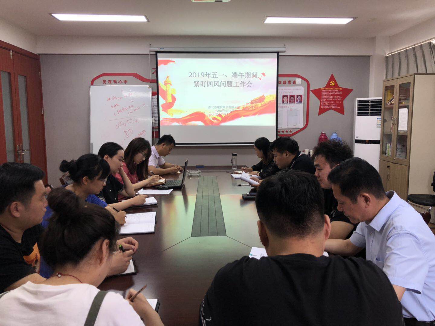 2019年6月3日下午,商貿(mào)公司總經(jīng)理周敬安,副總經(jīng)理金曉莉主持召開(kāi)2019年“五一”、端午期間緊盯四風(fēng)問(wèn)題工作專題會(huì)議。